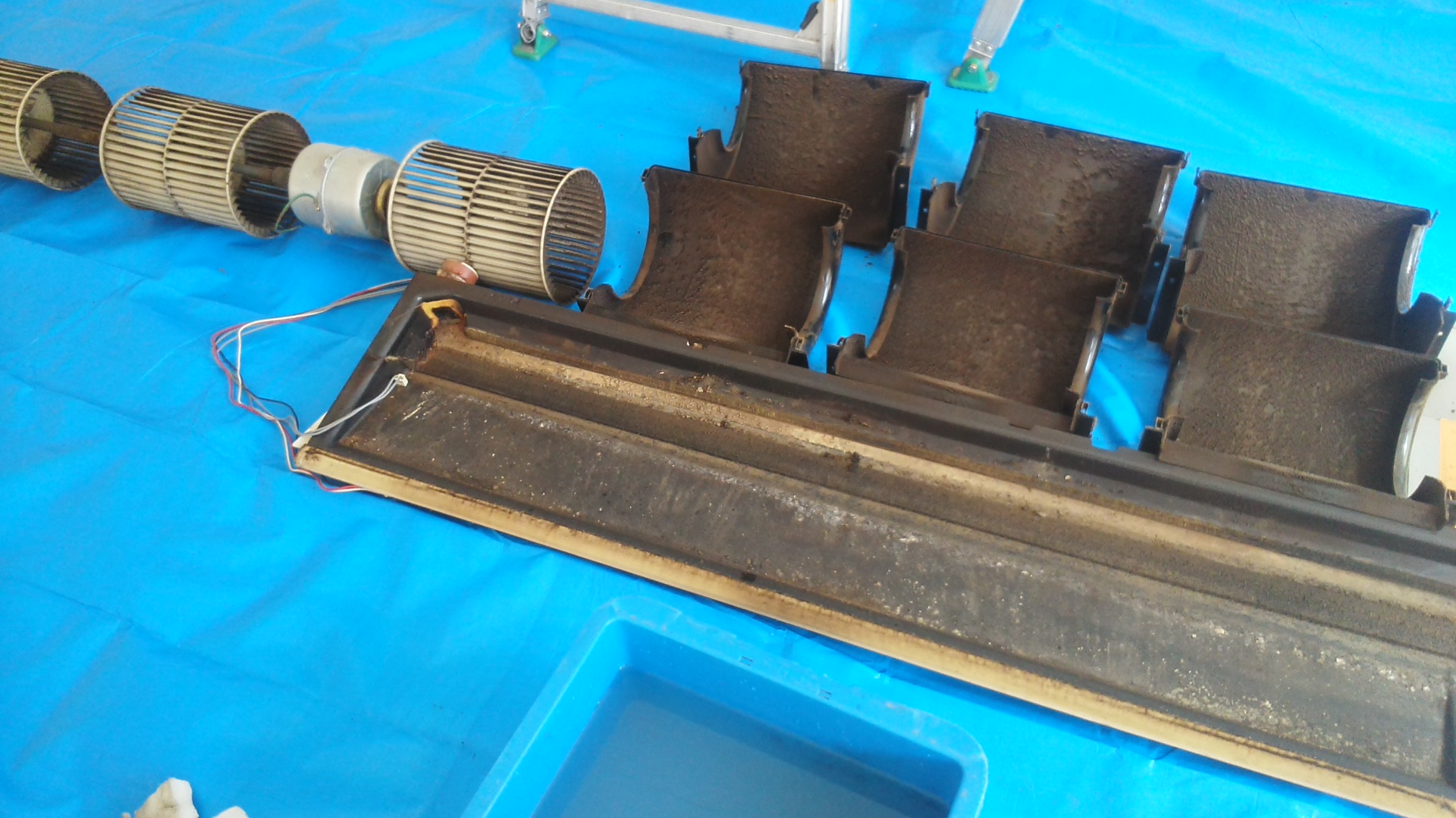 写真2:パネル関係、ドレンパン、ファンモーター、配線等、洗浄可能な状態に分解しているところ。