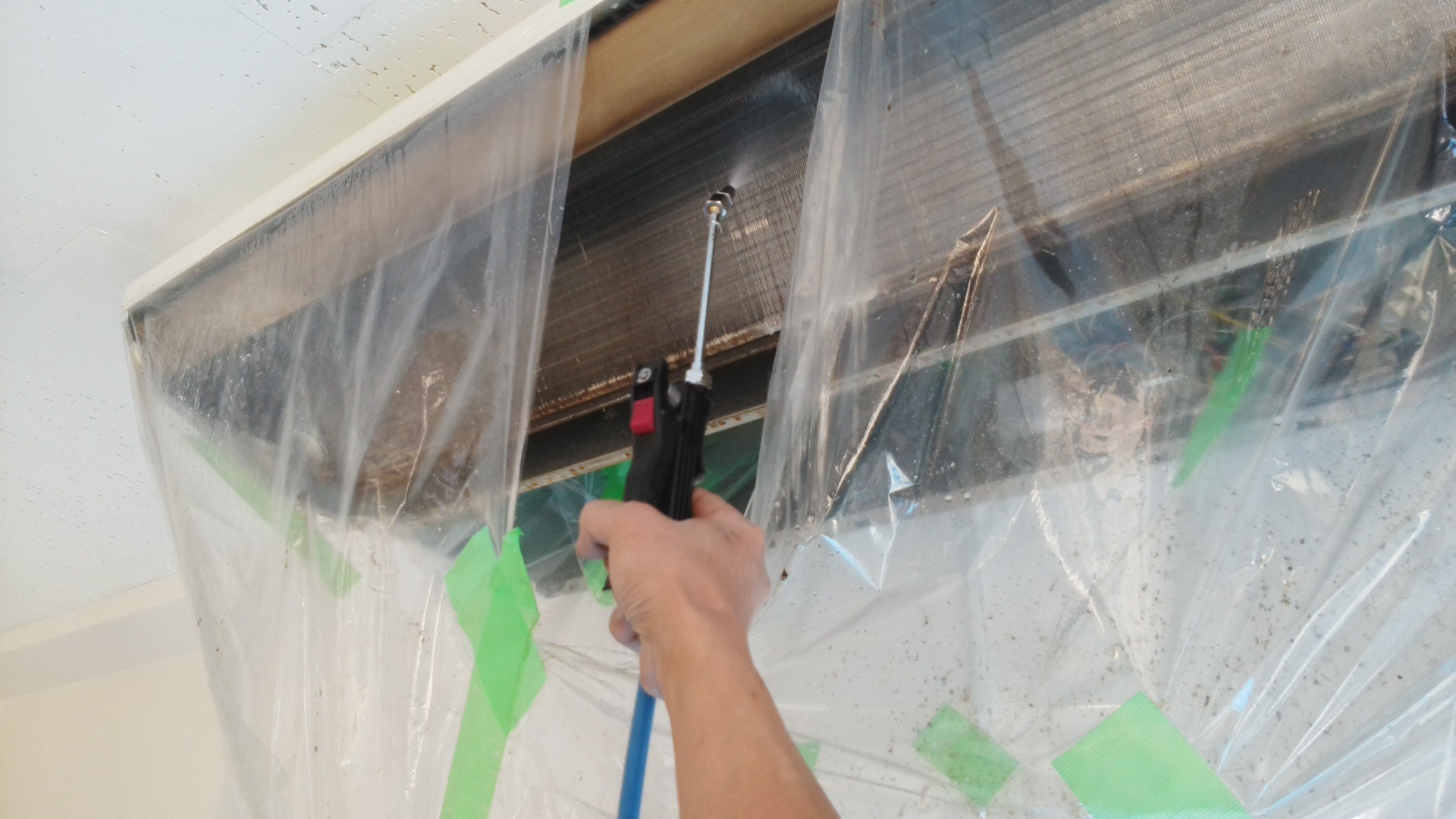 その後、業務用エアコンクリーニング専用洗浄剤をまんべんなく吹付!・・・
