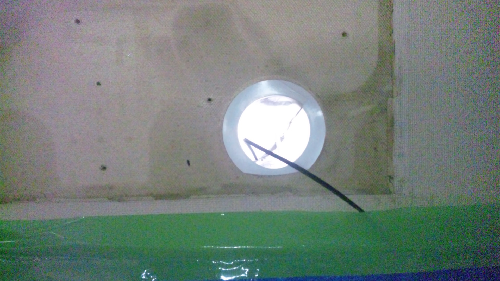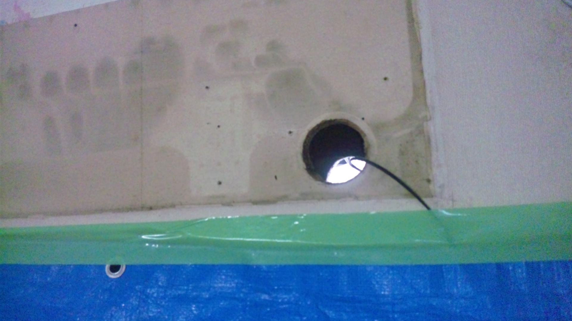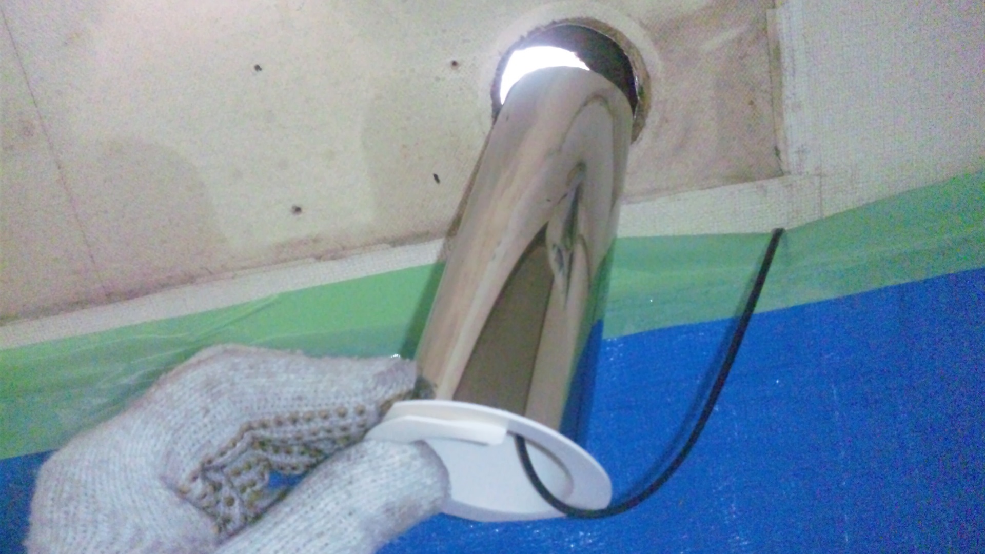 写真1:ネズミ被害でゴミが落ちないように養生した上で、室内機を撤去後の貫通穴の状態(光ケーブルも一緒)。