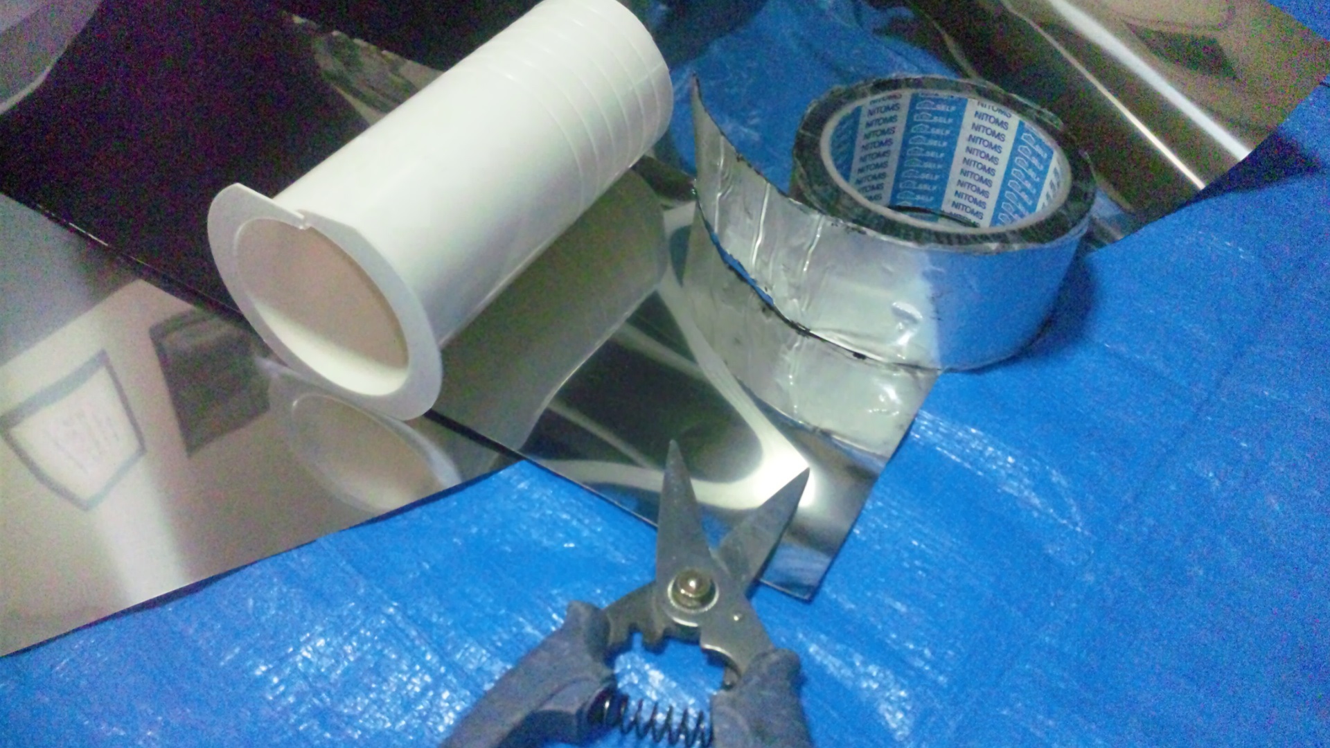 写真2:貫通スリーブは光ケーブルを通す為割いて、かじり防止のステンレス板をスリーブ外側へ巻く準備。