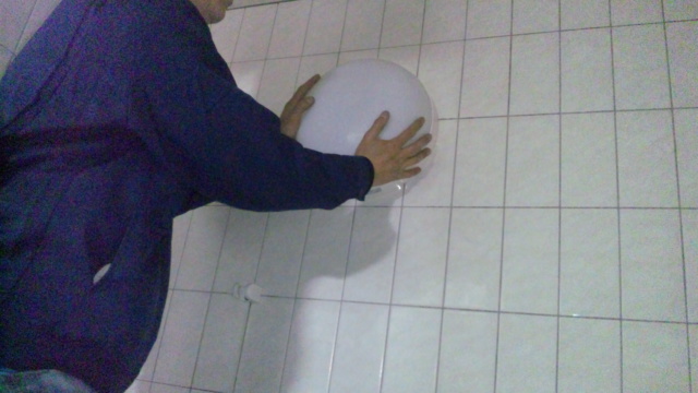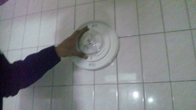 そして配線処理及び固定ネジを取り、既存本体を外した後、タイルについた器具跡をクリームクレンザーで掃除。(^^)