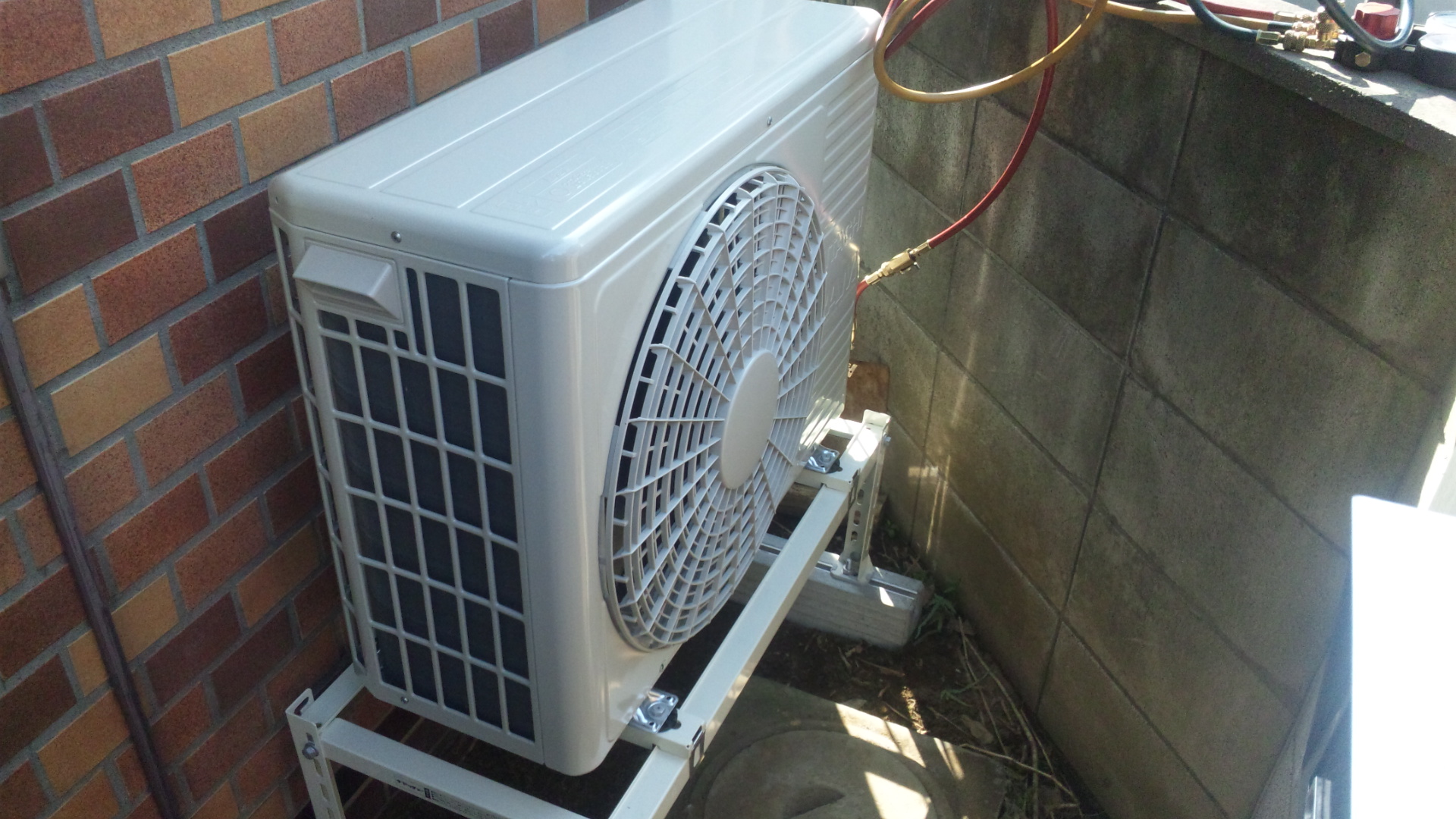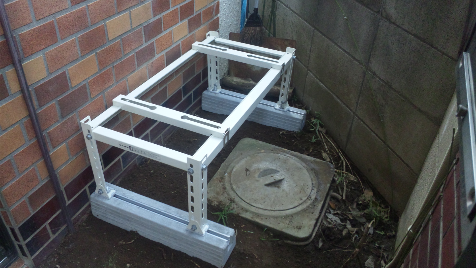 写真2:室外機の置き場所を、玄関脇に提案しました。オプションですが架台とコンクリートブロック使用。