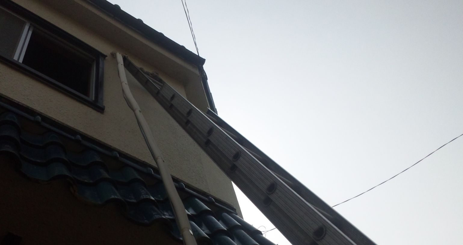 写真3:2段ハシゴで配管を接続して、電線とドレンホースを一緒に巻き込む準備して、化粧テープを巻きます。