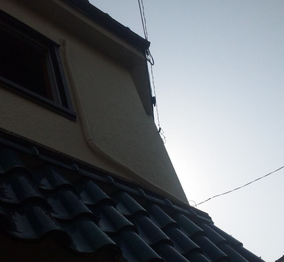 写真9:こちらの室外機は2Fのベランダへ。(右ガレージ屋根に板を引いて足場を作り配管しました)