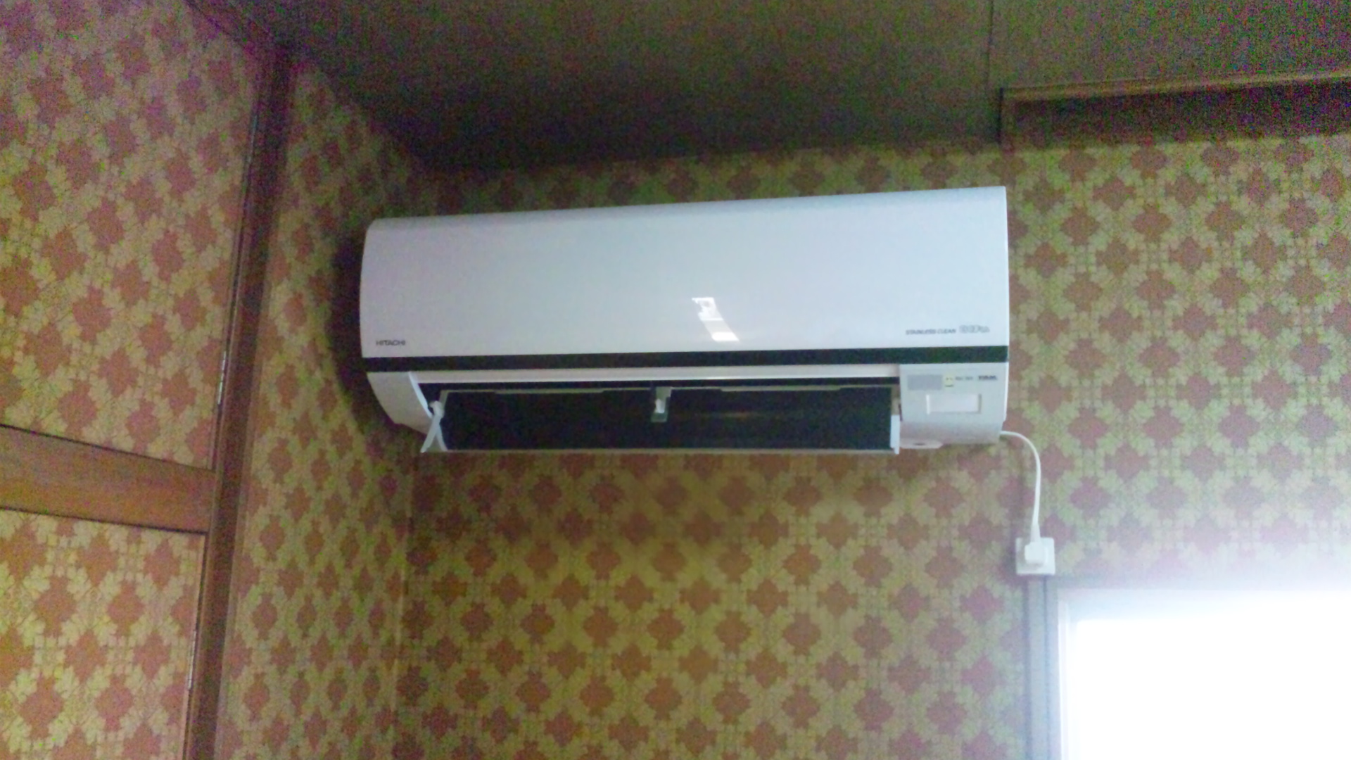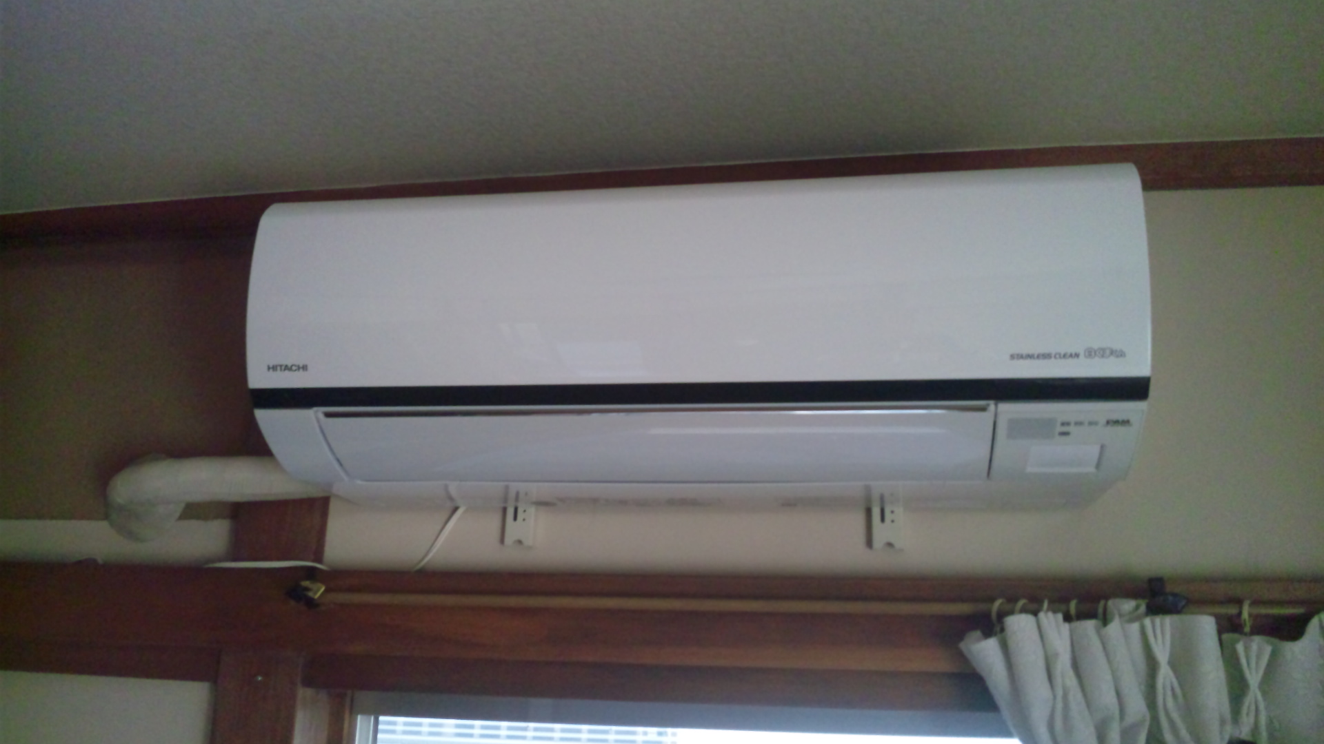 写真10:1Fの室内機。取付完了後の写真。3月発売ステンレスクリーンPAM白くまくん日立RAS-SV22Dです。