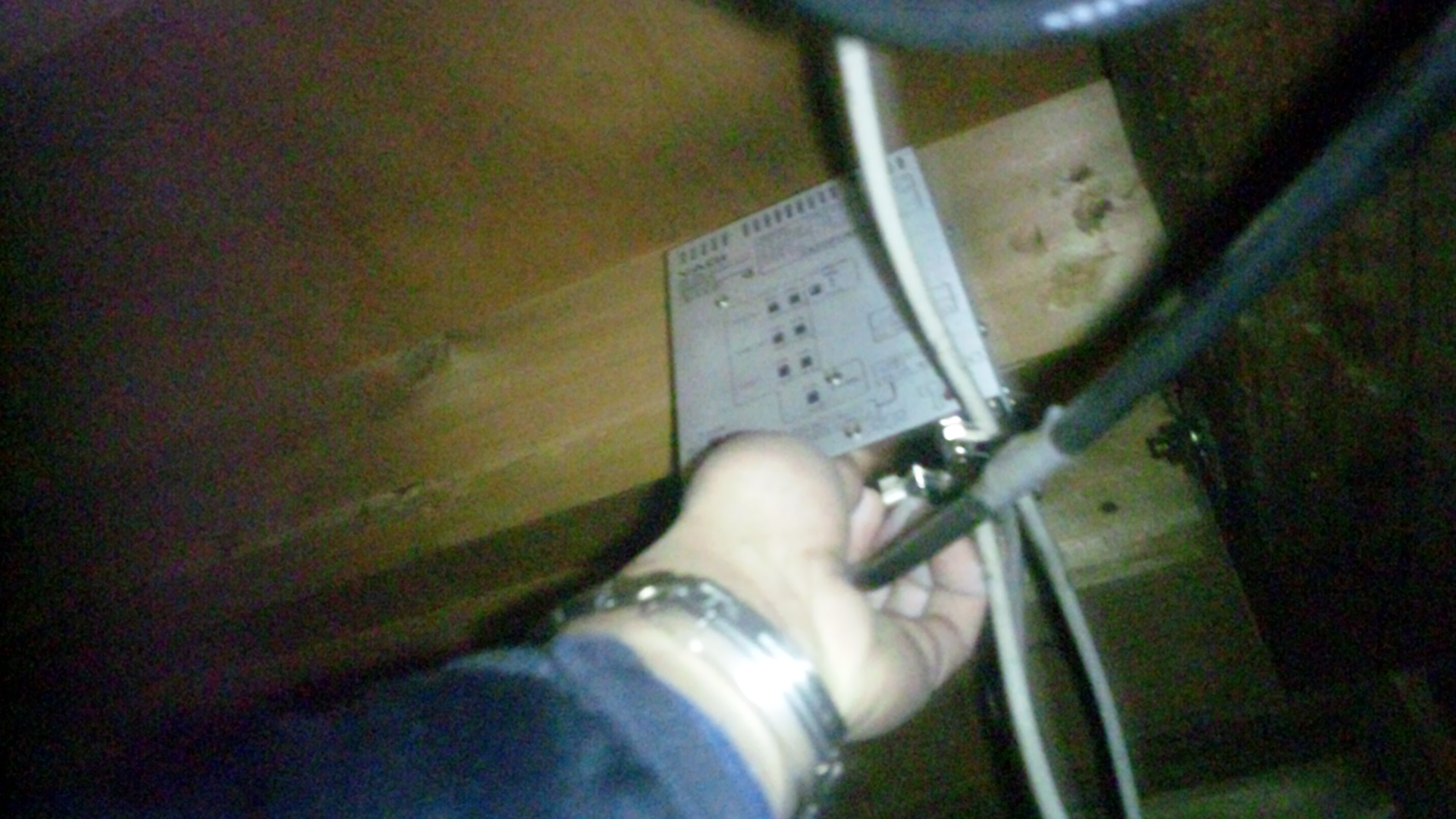 写真2:天井裏にて、屋外でUHF/BS混合されたケーブルの入力レベルを測定及びブースター出力も点検。