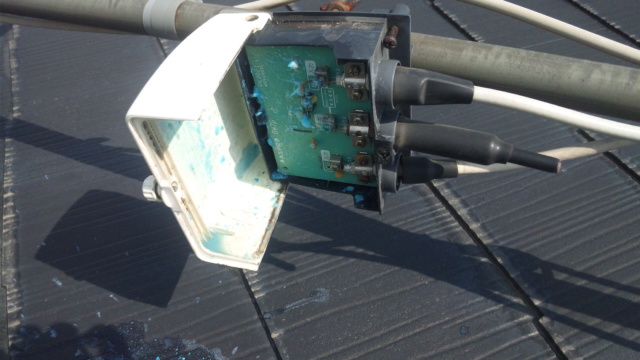 写真2:それはBS/UHF混合器が倒れ逆さになり、雨水が内部に入って基板(銅板)が水と反応して緑青が吹いてますね。