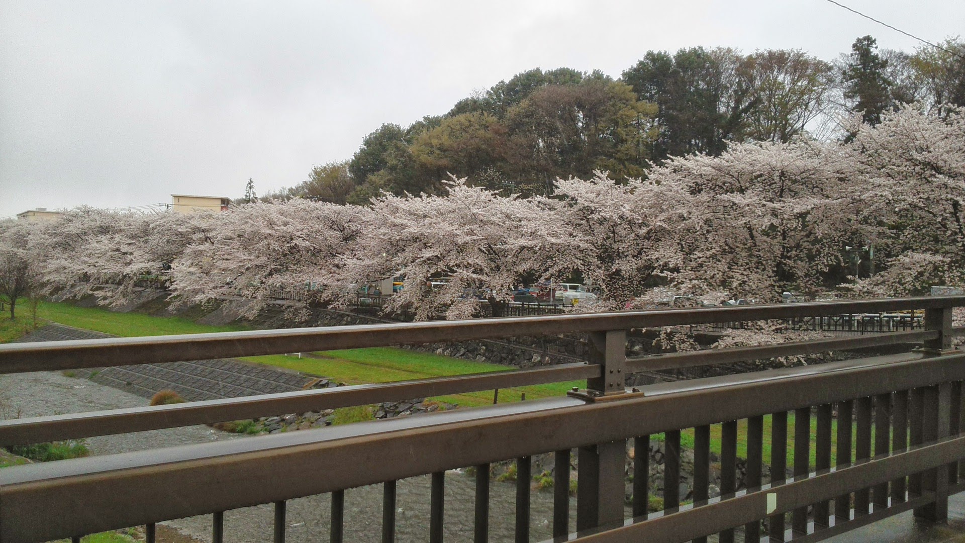写真1:雨が止むのを期待しつつ作業車で移動中、清瀬市にて桜が満開の公園。
