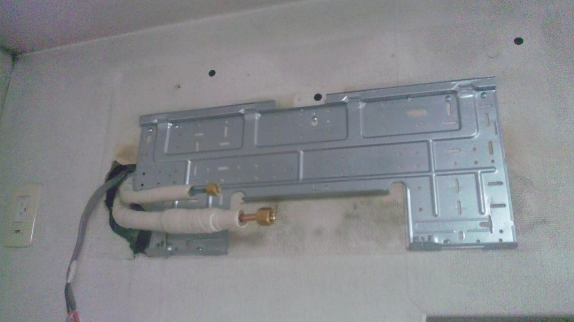 写真1:既存ガスエアコンを撤去し、新しいエアコン室内機の取付板を取り付けた所。