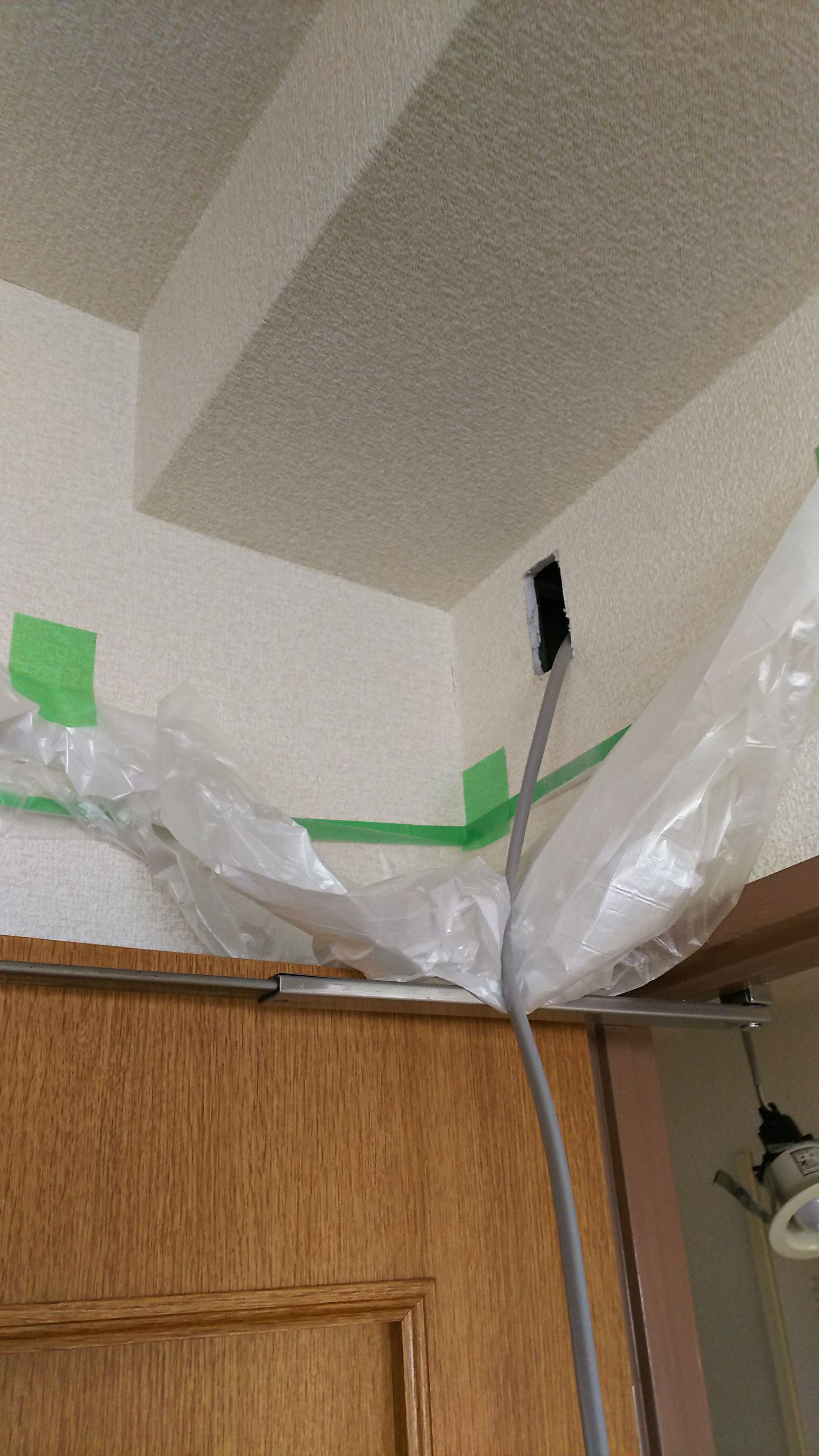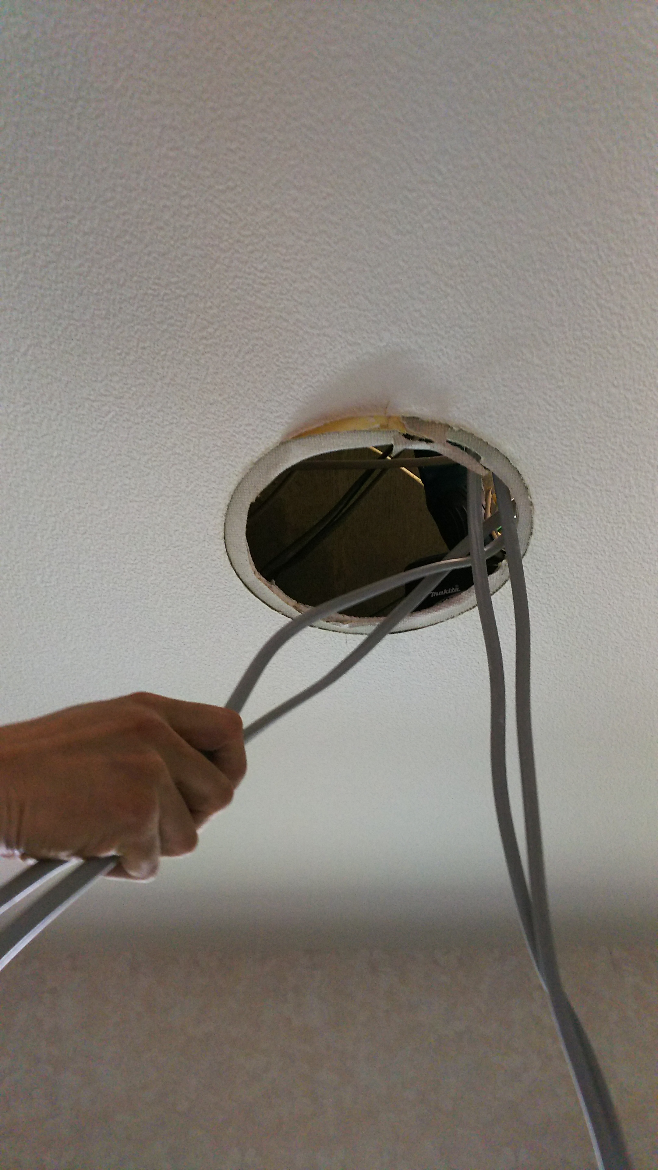 写真2:天井のダウンライトを外し、中継地点としてケーブルを通しているところ。