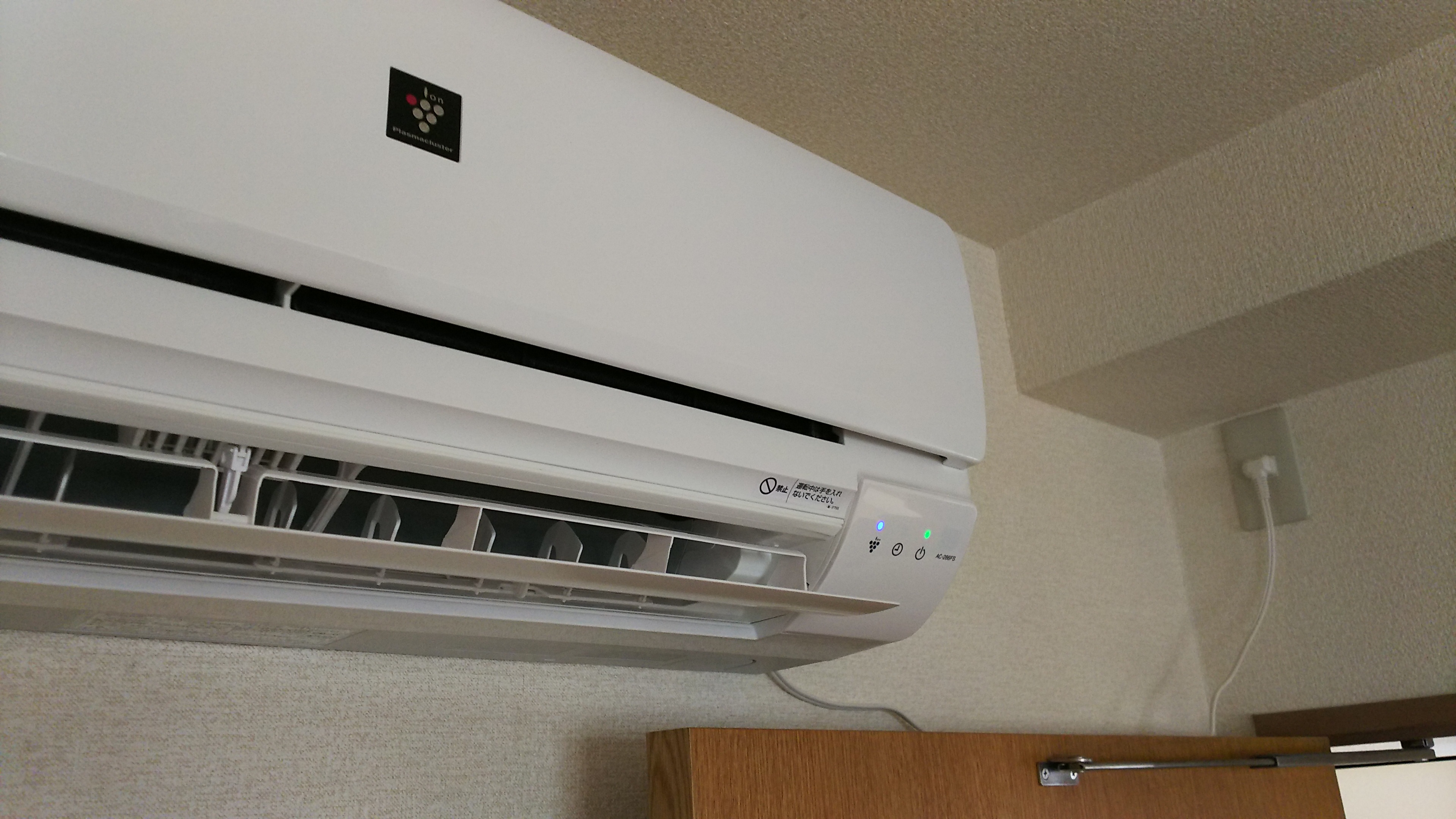 写真4:エアコンを設置して、隠ぺい配線した専用コンセントの新設も終わり、試運転をしているところ。