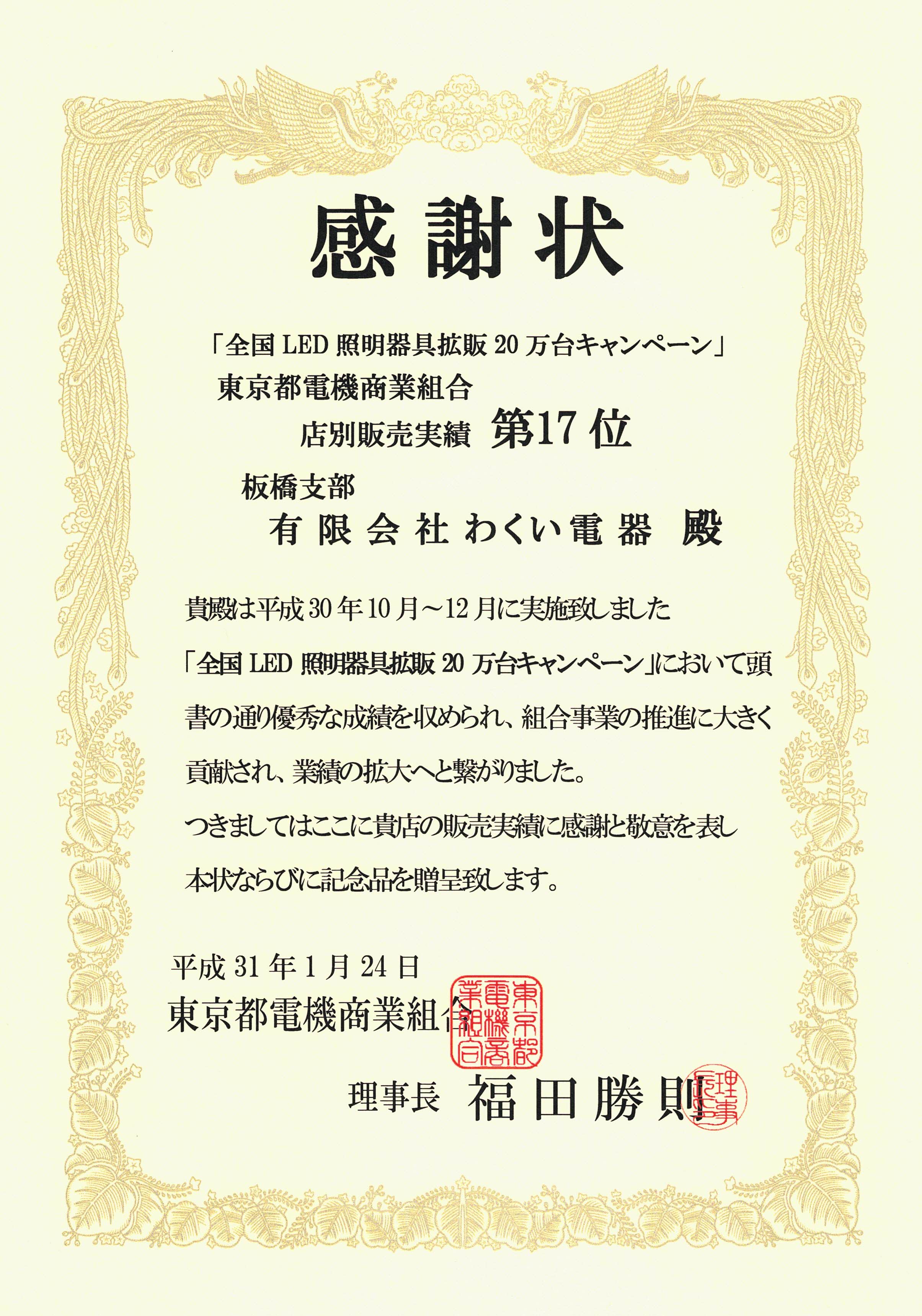 そして、トップページにも掲載しております「全国LED照明器具拡販20万台キャンペーン」東京都電機商業組合では
