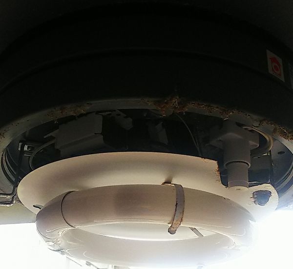 共用部廊下等調べた結果、一部の照明器具に“雨漏り”があり器具カバー内が水没!