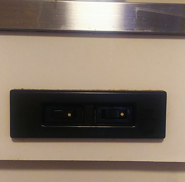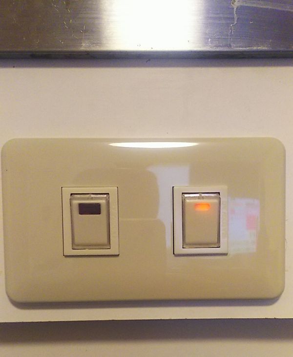 写真1:既存ミニキッチンのスイッチ。これは電源とスイッチを内部で結線している専用品です。