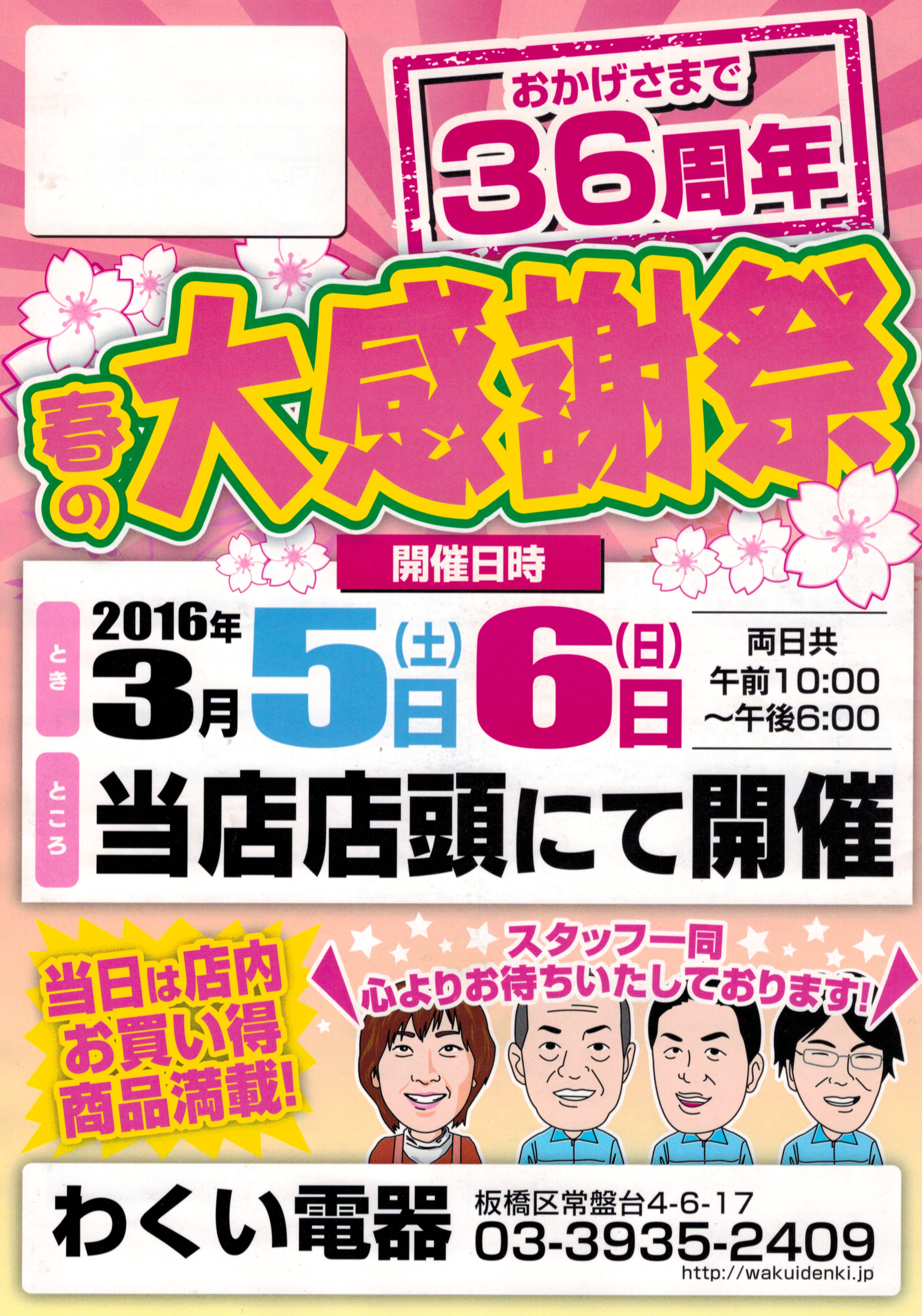 いつもお世話になっております。3月5日(土)・6日(日)は、おかげさまで創業36周年「春の大感謝祭」を店頭にて開催いたします。当日は、日頃の感謝の気持ちを込めまして、全品大放出及び記念品をご用意いたしております。社員一同皆様のご来場をお待ちしております。