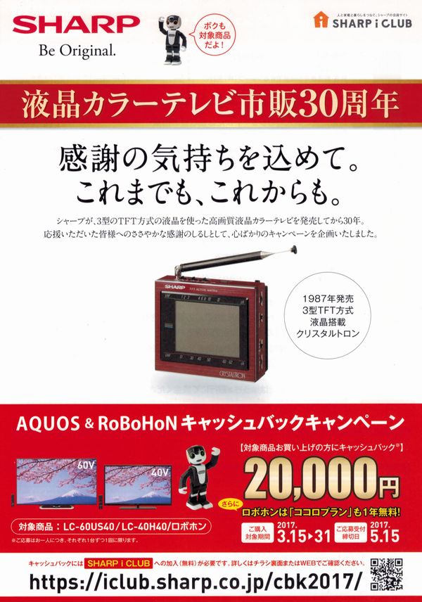 SHARP「液晶カラーテレビ市販30周年」感謝祭、対象商品(LC-60US40/LC-40H40)お買い上げで20,000円キャッシュバックキャンペーン平成29年3月31日まで。この機会に、迫力の4Kテレビを是非お求めください!
