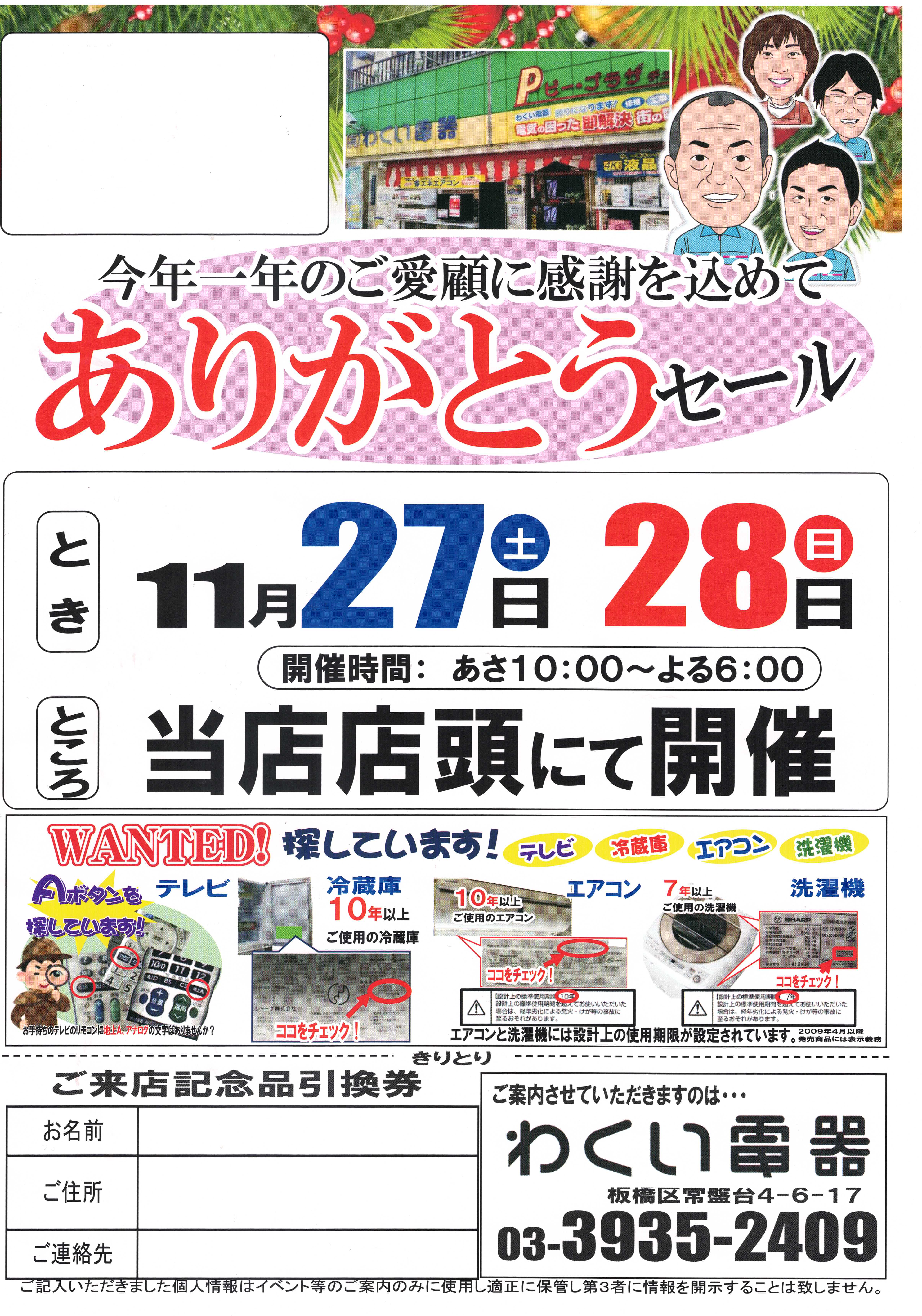 いつもお世話になっております。11月27日28日ありがとうセールを開催いたします。