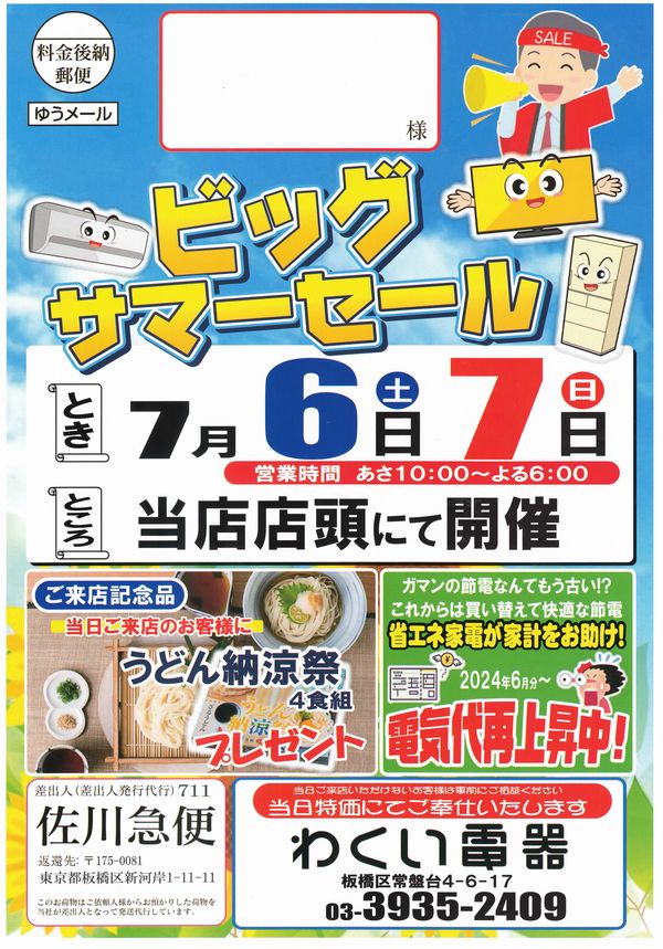 いつもお世話になっております。事前にご案内いたしました「ビックサマーセル」を7月6日7日開催いたします!