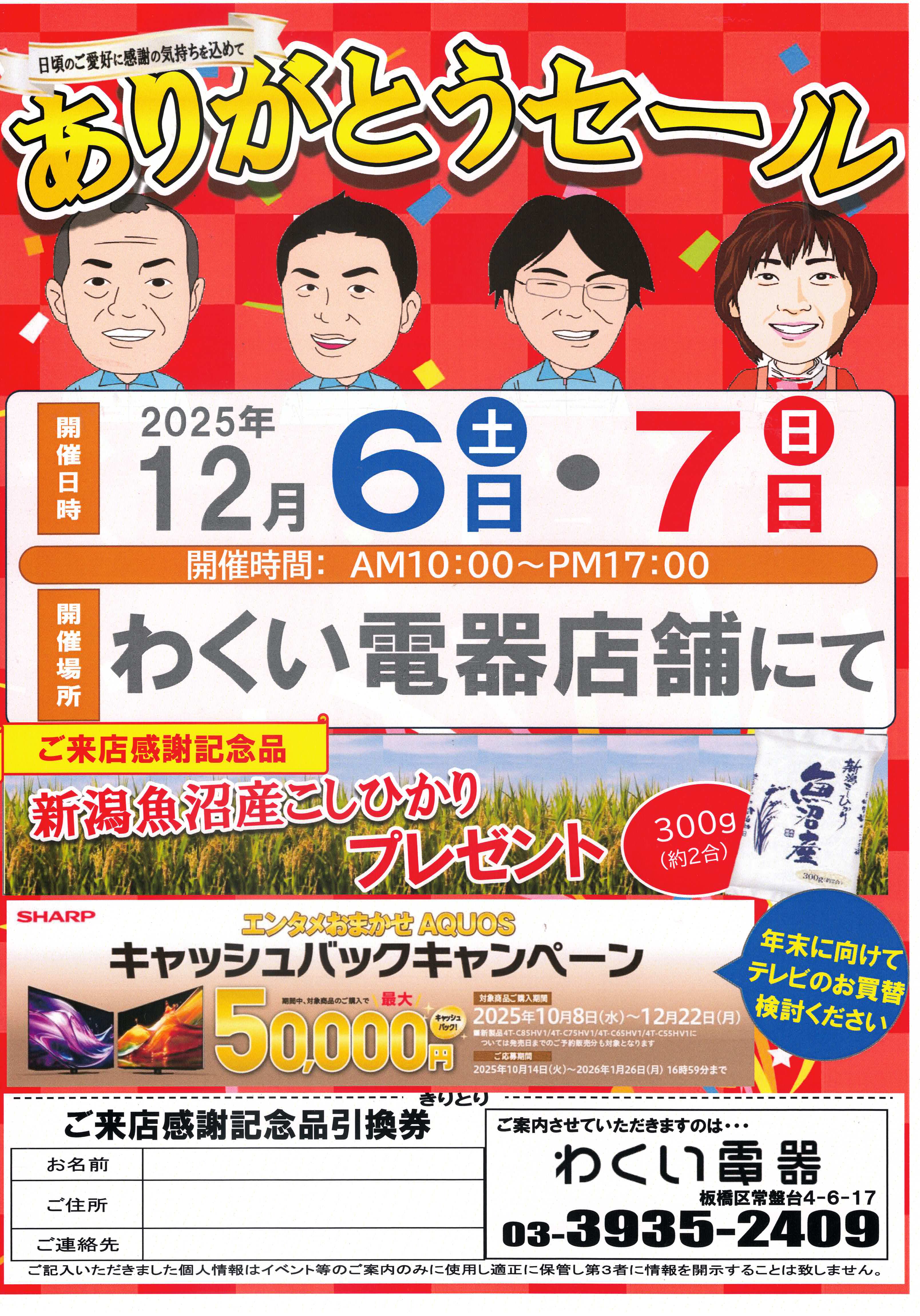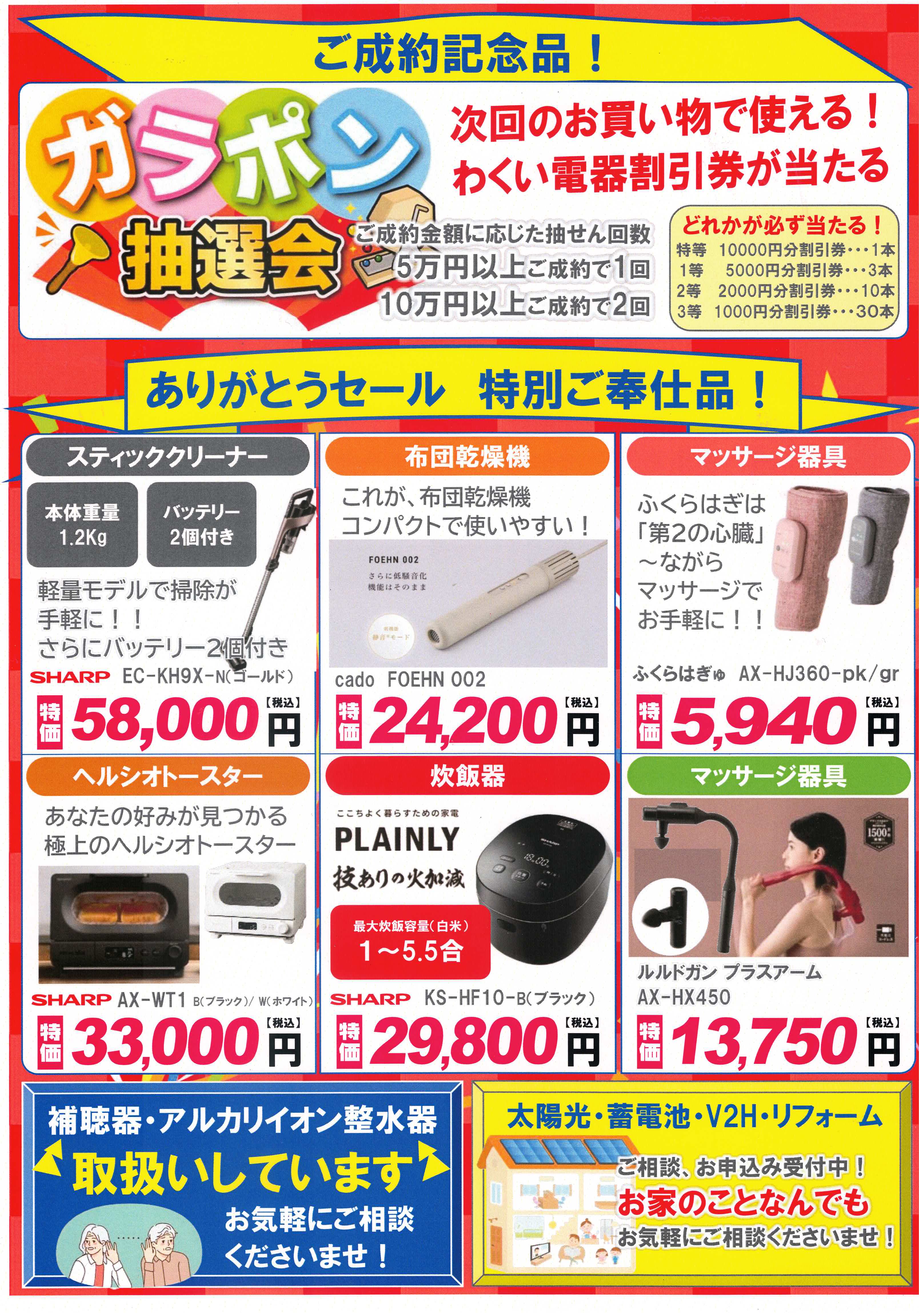 5万円以上お買い上げ特典「わくい電器値引き券」進呈いたします。